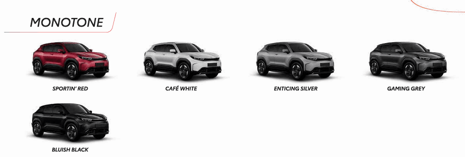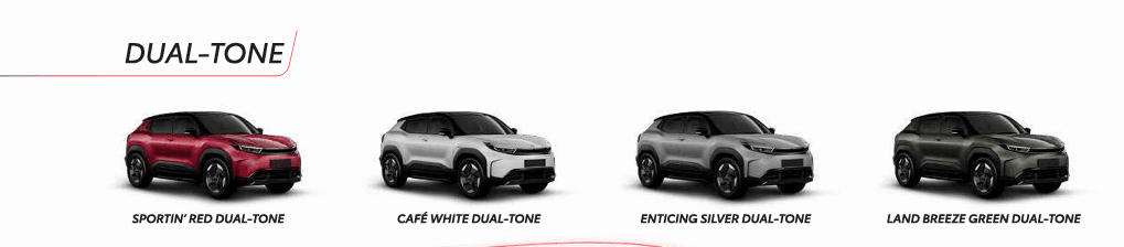 The Toyota Urban Cruiser Ebella comes with a stylish selection of exterior colors to suit different tastes. It offers 5 monotone options and 4 dual-tone options.