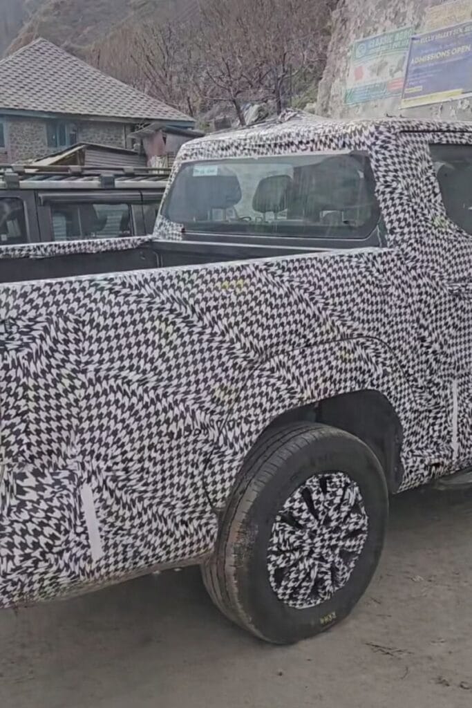 The rear extends into a practical cargo bed supported by leaf springs, ensuring excellent load-carrying strength and off-road resilience. High ground clearance, rugged body cladding, and a commanding presence make it look ready for India’s varied terrains from mountain passes to highways.